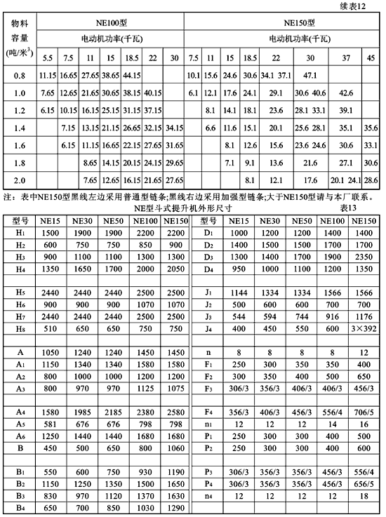 NE型斗式提升機的規格性能列入表10;驅動裝置型號列入表11;不同提升高度所需的驅動裝置功率列入表12。 驅動裝置有左裝和右裝兩種,可按用戶要求配置。面對提升機進料口,驅動裝置在提升機左側為左裝;在右側為右裝。