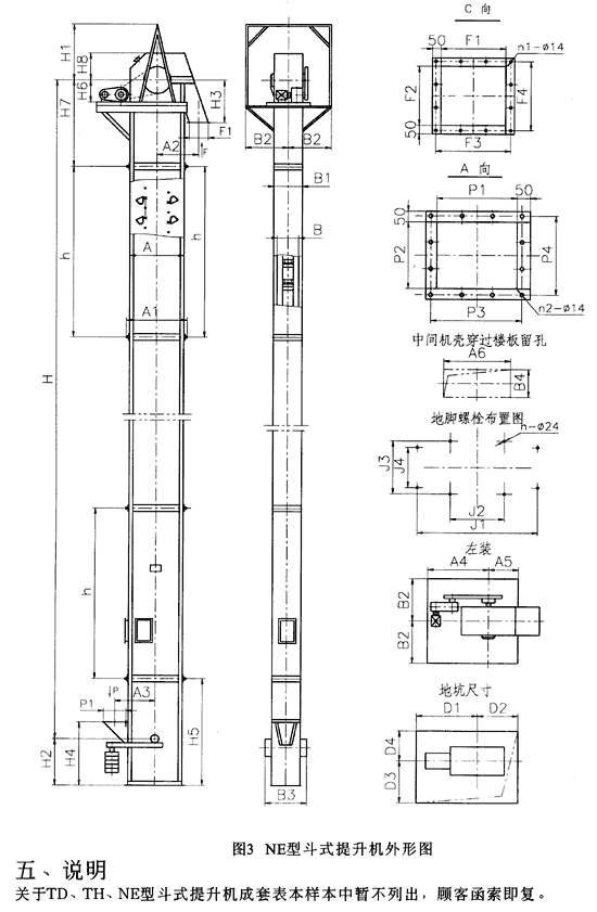 NE型提升機的組合尺寸本樣本中暫末列出,每臺提升機一股只配套一節帶有檢視門的中間機殼。若用戶要求增加帶檢視門中間機殼數量或改變檢視門的開孔位置,應在訂貨時注明。